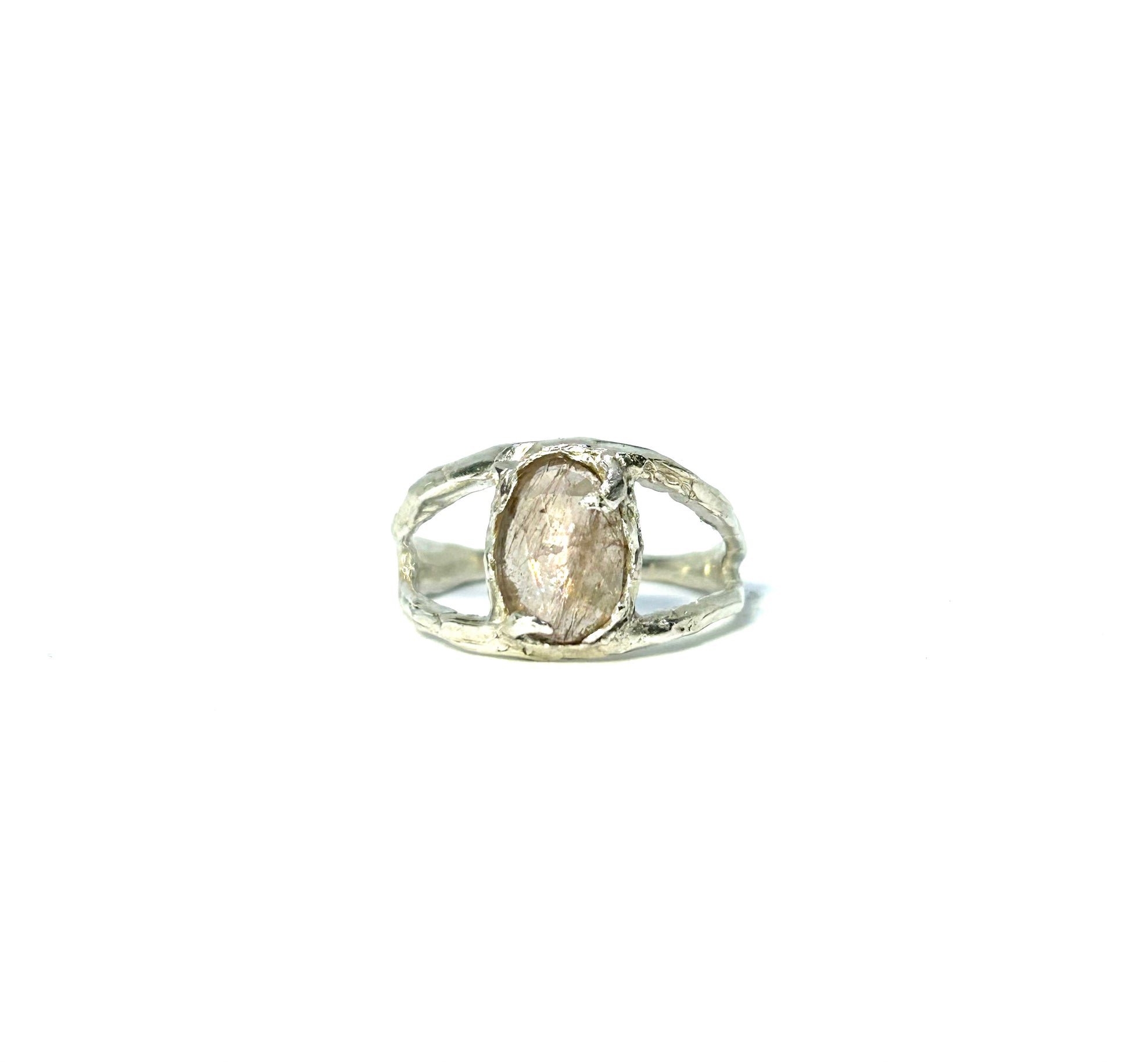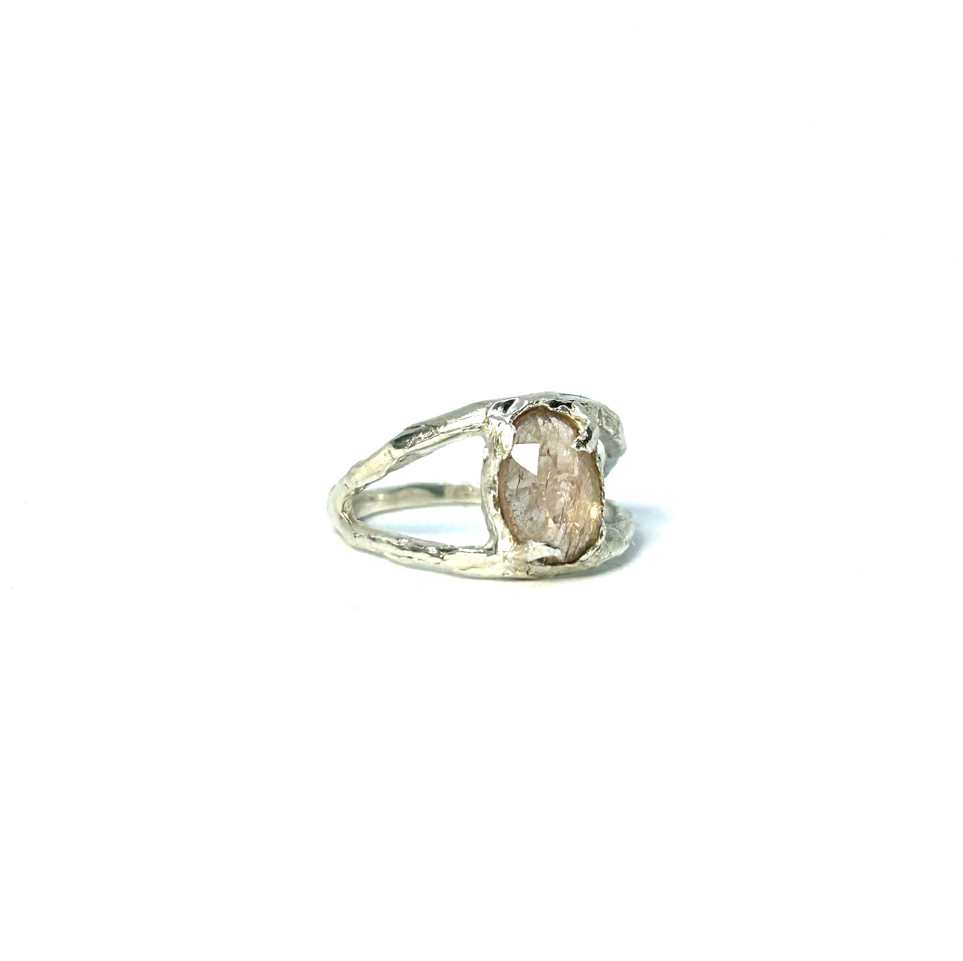 Though delicate in appearance, the piece is crafted with a sturdy, thoughtfully balanced band, giving it a comfortable and reassuring feel while maintaining its airy elegance. The contrast between the gem’s luminous softness and the organic motion of the silver creates a sense of quiet magic, as if the ring captures a moment mid-transformation.