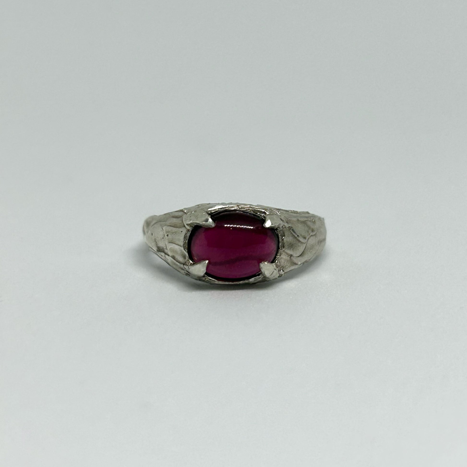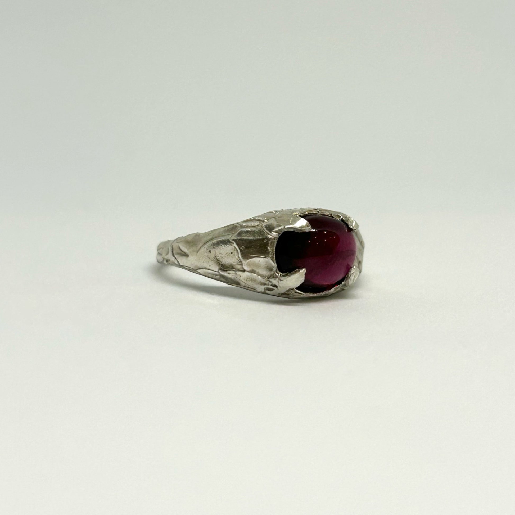 Set like a small celestial body within the molten silver, the fiery garnet becomes the focal point of your orbit: a quiet centre, a point of colour and intention.