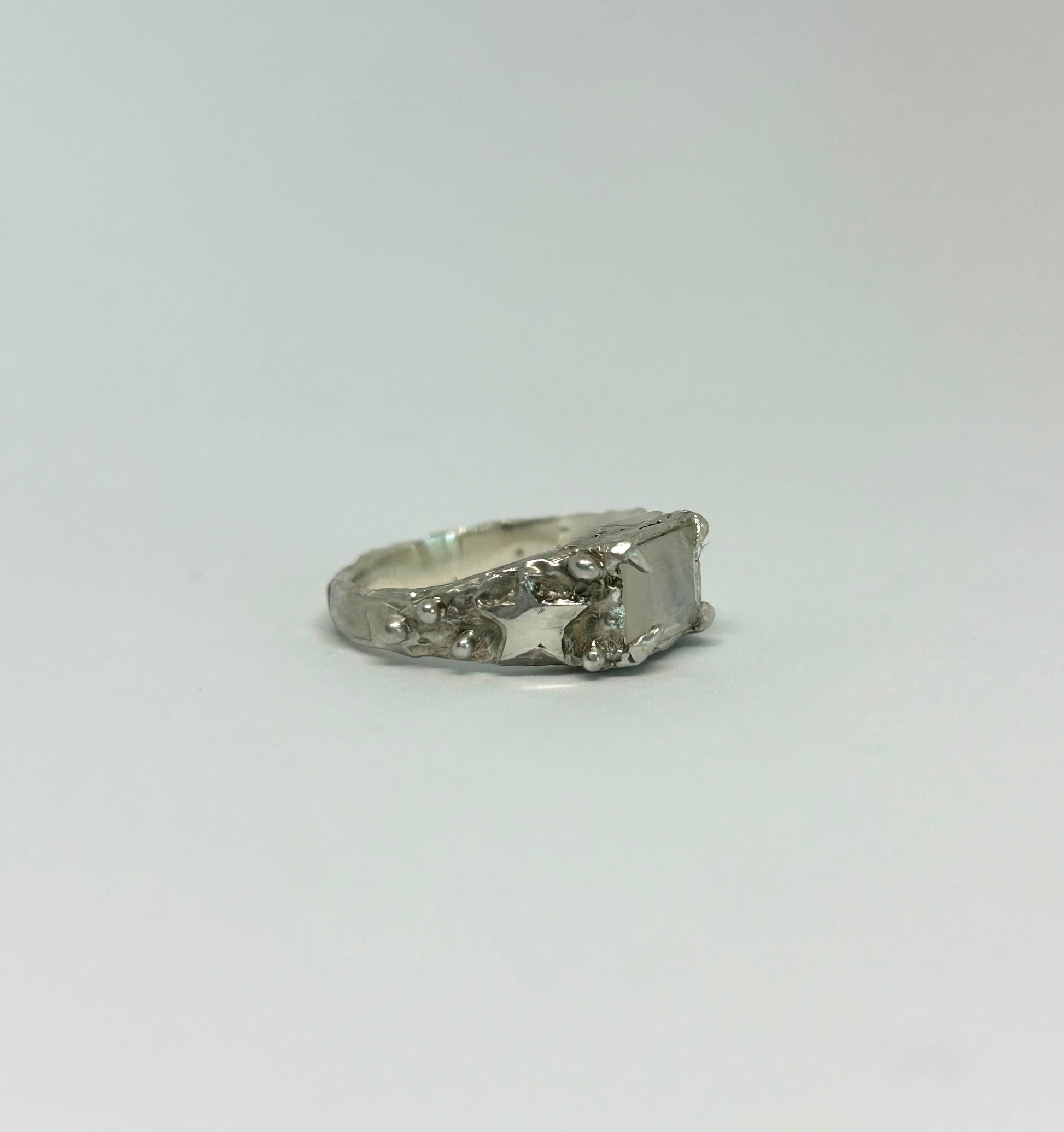 The band is intentionally chunky yet thoughtfully balanced, giving the ring a substantial presence without feeling heavy or overpowering. On either side of the moonstone, two stars are carved onto the silver, accompanied by delicate silver beads that add texture and a touch of celestial ornamentation. The combination of the moonstone’s ethereal glow, the grounded weight of the band, and the fine stellar details creates a piece that feels both mystical and effortlessly wearable.