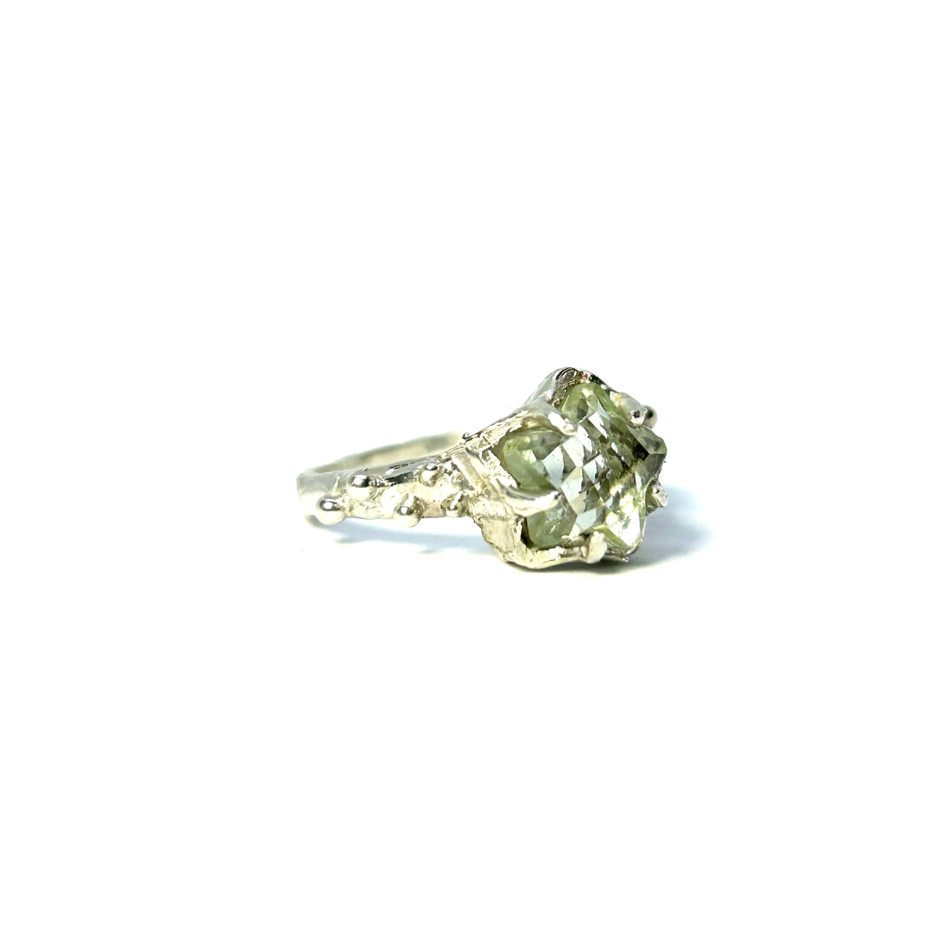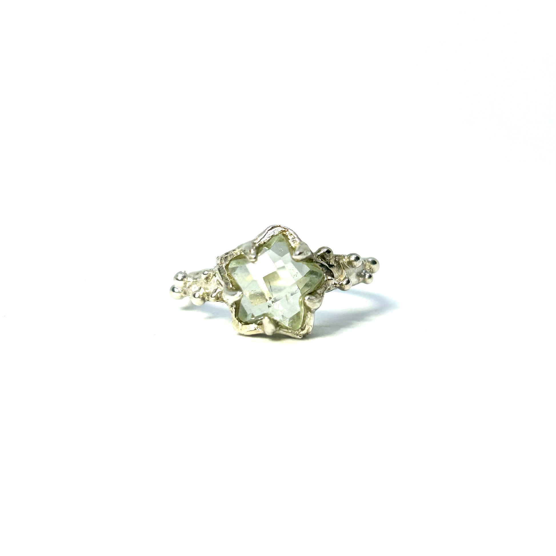 The Starburst ring centres a bold, star-shaped green amethyst — a gemstone carved with soft, sculptural edges that catch the light in a gentle glow. The star sits proudly atop a sterling silver band, its surface detailed with tiny hand-formed silver beads that create a delicate, shimmering texture.
