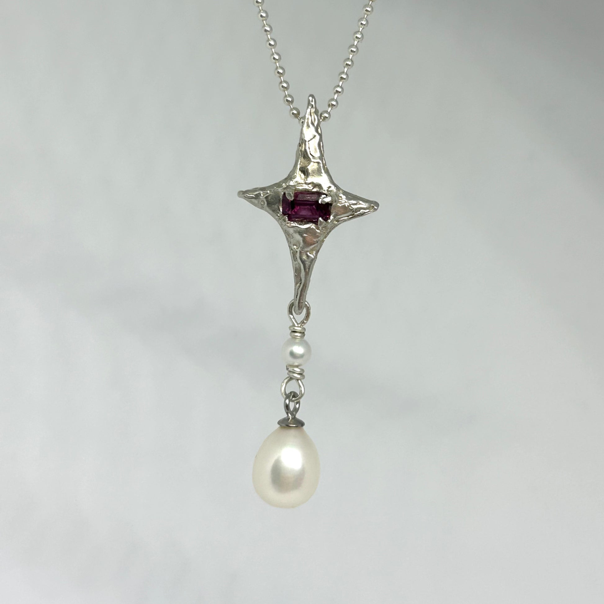 The Stella pendant is a delicate study in light and balance. At its centre, a baguette-cut rhodolite garnet is set like a warm spark, its elongated shape catching flashes of rosy crimson as it moves. A freshwater drop pearl hangs below the star-shaped pendant, suspended on solid silver wire.