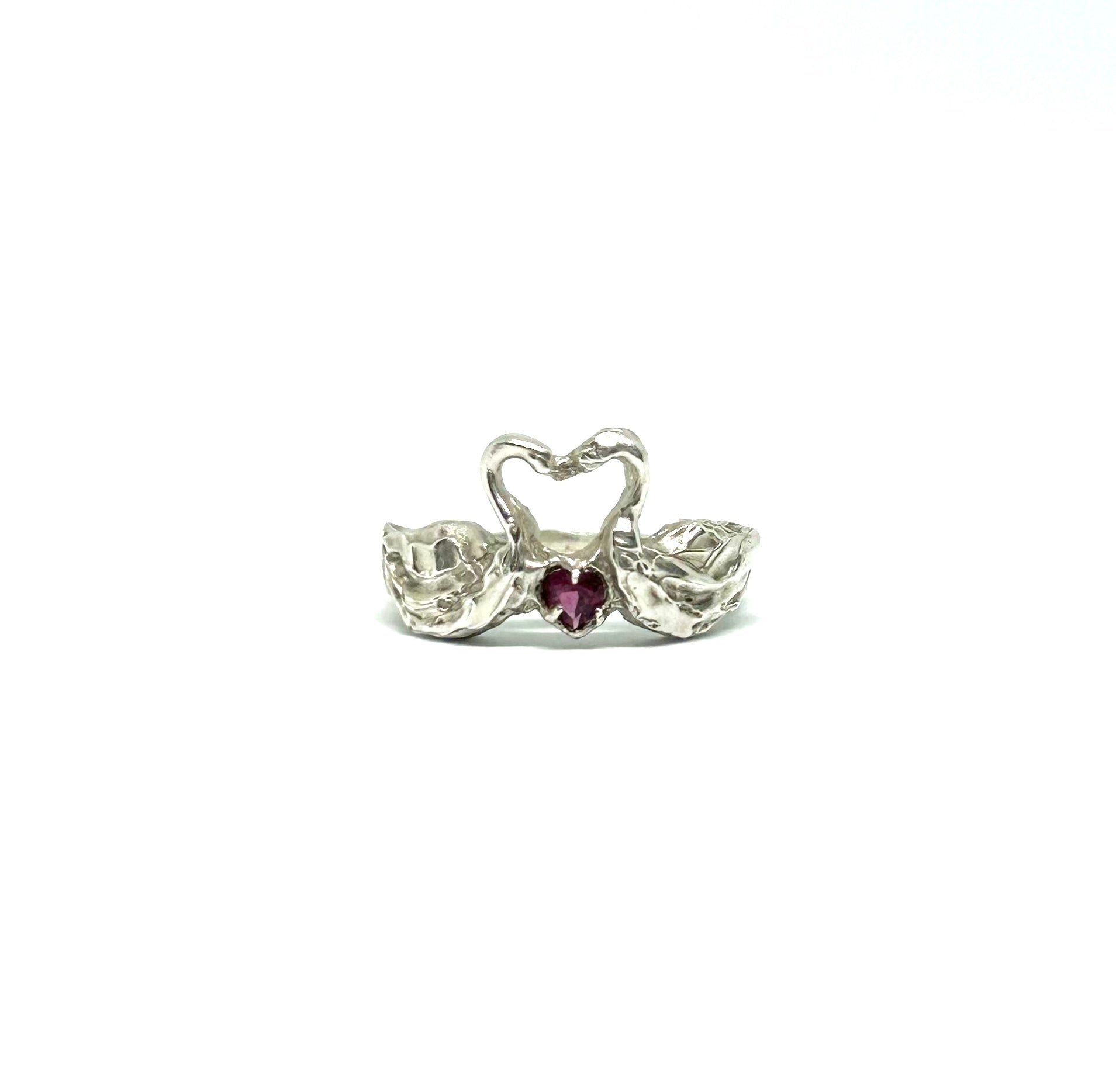 The Swans in Love ring captures that rare kind of devotion — quiet, enduring, gentle in its power. Two hand-formed swans curve toward one another in a fluid embrace, their necks meeting to frame a delicate heart-shaped gemstone at the centre. Every curve is sculpted by hand, every feather mark chosen, every silhouette unique — no two rings will ever be the same, just as no love story ever repeats itself.