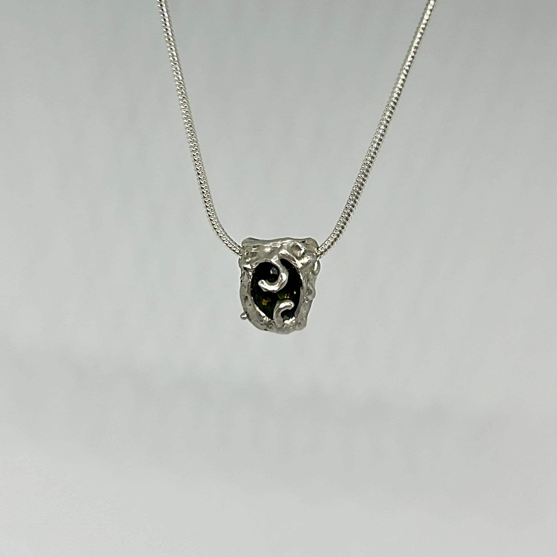 The Tourmaline Vase necklace is a spring-walk essential: a wearable solid silver vase for your tiny bouquets, adorned by a deep green tourmaline. This piece will add some whimsy to your days, designed to look magical both with or without a flower.